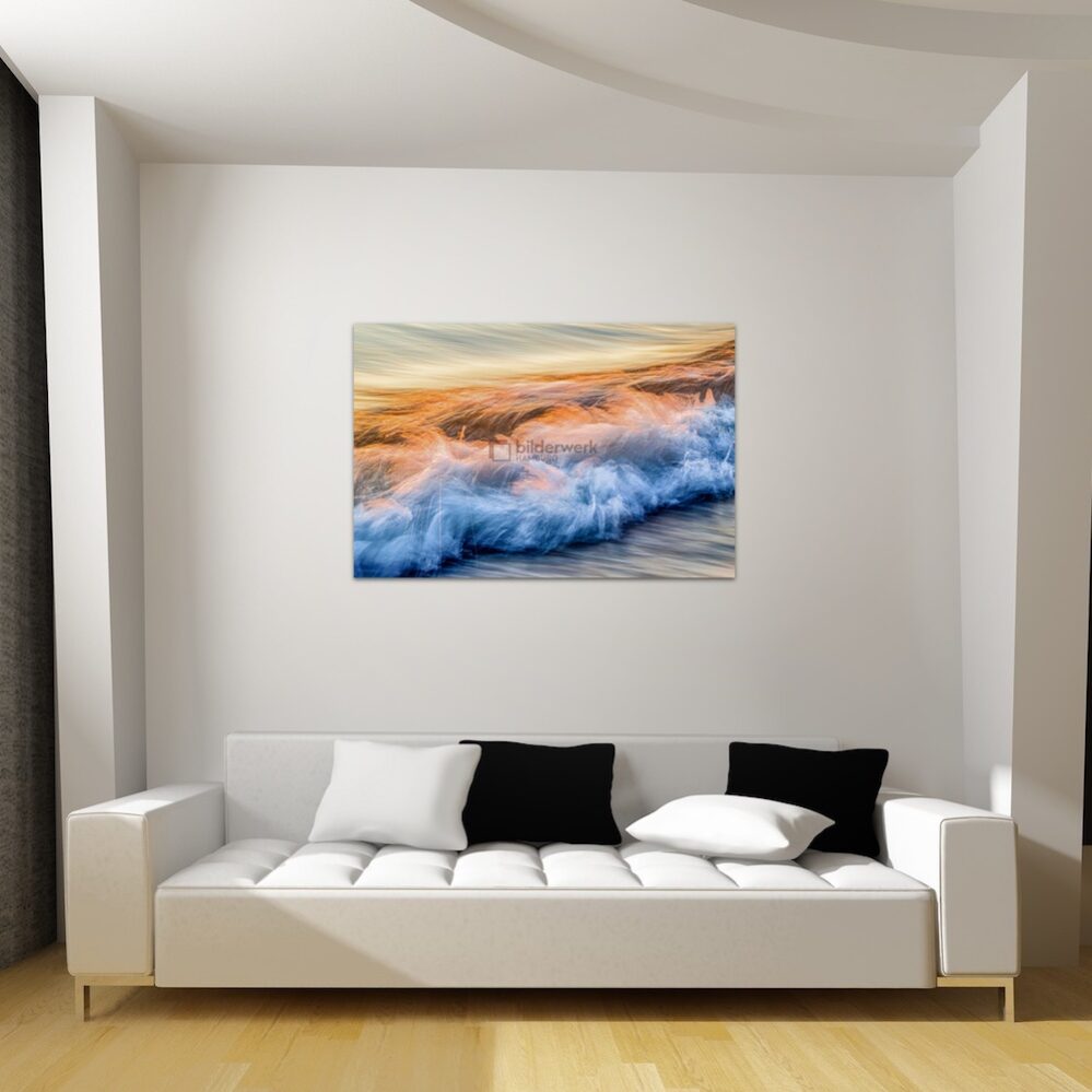 Eine Welle bricht sich in der Morgensonne am Ostseestrand, beeindruckende Fotokunst mit den besonderen Motiven vom Meer als anspruchsvolle Wandbilder