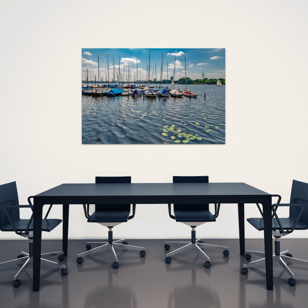 Sommerstimmung an der Aussenalster mit Blick in Richtung Innenstadt, die schönen Impressionen von der Binnen- und Aussenalster in Hamburg als Motive für Wandbilder auf Leinwand, Alu-Verbundplatte und in Galeriequalität
