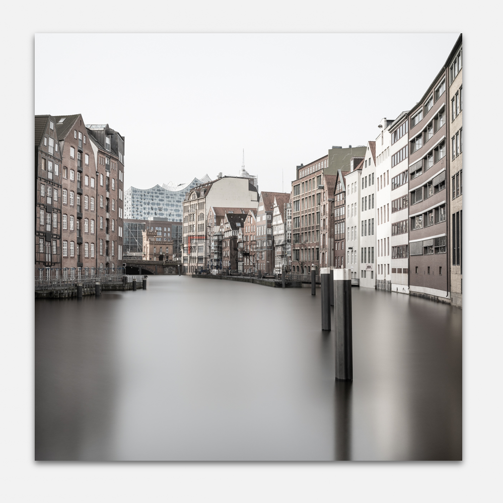 Ein kunstvoll inszenierter Blick auf das Nikolaifleet mit den historischen Häusern von der Deichstraße und dem Cremon, die exklusiven Blickwinkel aus der Stadt Hamburg als Wandbilder auf Leinwand, Alu-Verbundplatte und in Galeriequalität