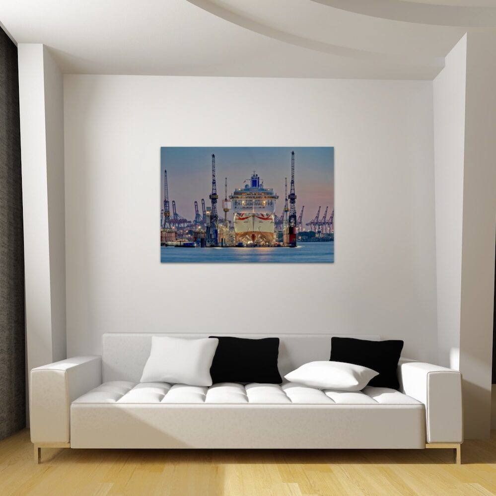 Abendstimmung im Hafen mit Blick auf das Passagierschiff AURORA im Dock von Blohm & Voss, die schönen Impressionen aus dem Hafen in Hamburg als Fotokunst für Wandbilder auf Leinwand, Alu-Verbundplatte und in Galeriequalität