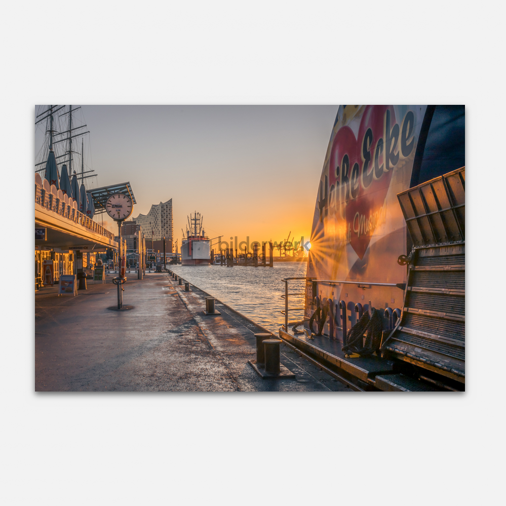 Die ersten Sonnenstrahlen an einem Wintermorgen an den Landungsbrücken, die schönen Motive aus dem Hafen in Hamburg als Fotokunst für Wandbilder auf Leinwand, Alu-Verbundplatte und in Galeriequalität
