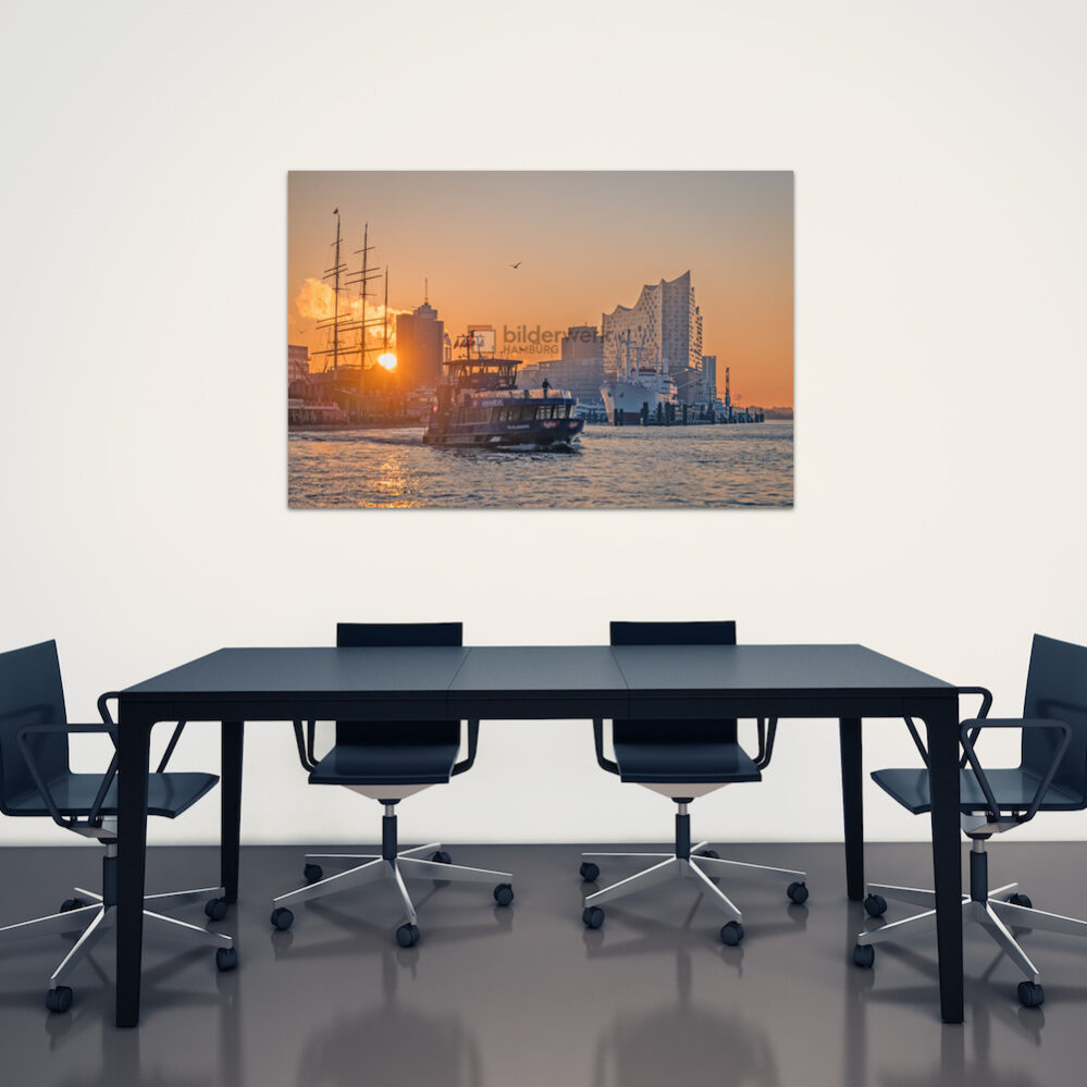 Ein stimmungsvoller Tagesbeginn im Herbst an den Landungsbrücken mit Blick auf die Elbphilharmonie an der Kehrwiederspitze, die schönem Bilder aus dem Hafen in Hamburg als Fotokunst für Wandbilder auf Leinwand, Alu-Verbundplatte und in Galeriequalität