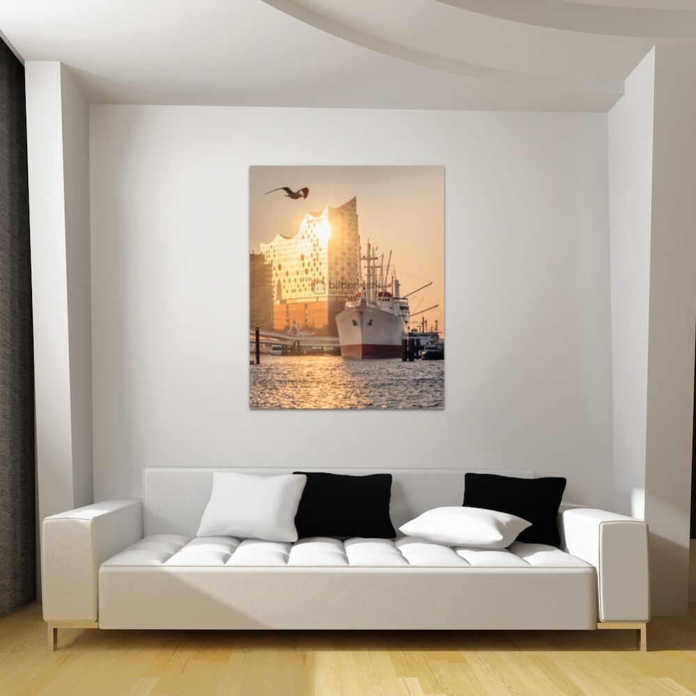 Wenn sich die Morgensonne in der Fassade der Elbphilharmonie spiegelt, die besonderen Bilder aus dem Hamburger Hafen als Fotokunst für Wandbilder auf Leinwand, Alu-Verbundplatte und in Galeriequalität