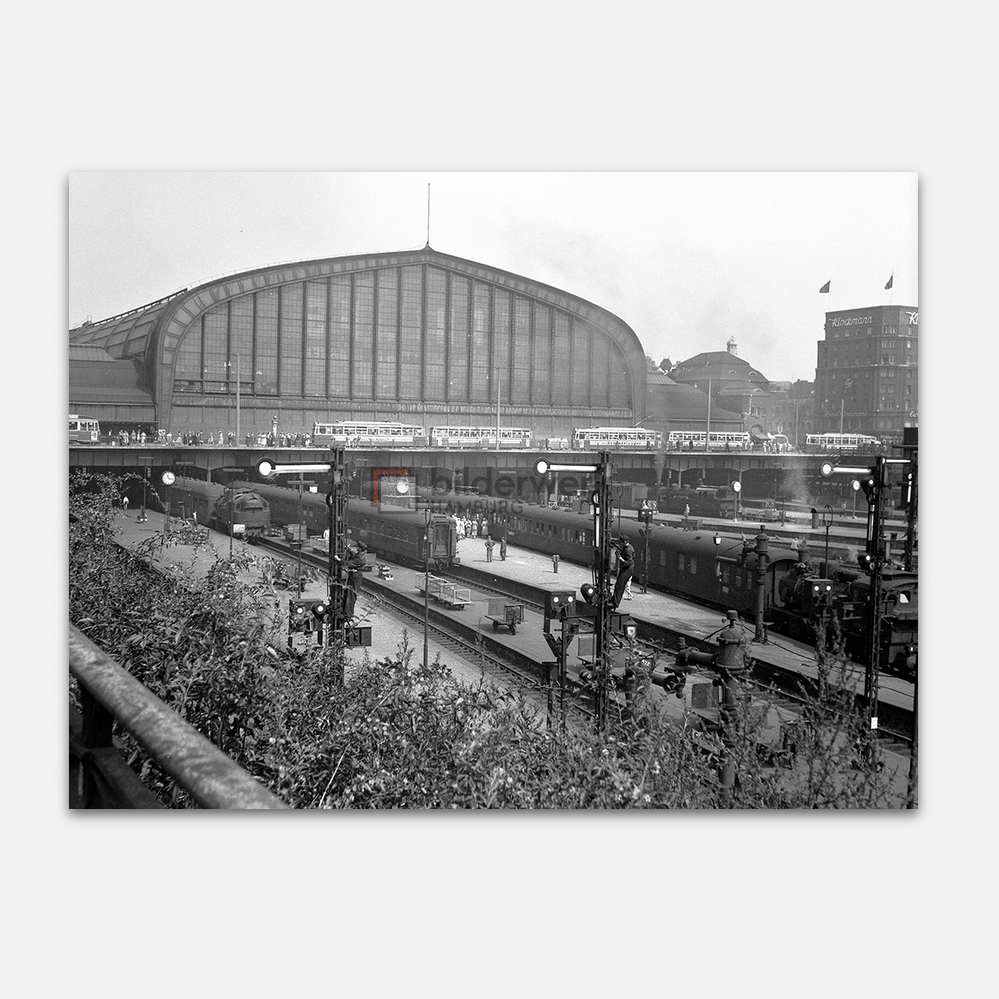 Blick auf den Hauptbahnhof Mitte der 50-iger Jahre mit den davor auf der Steintorbrücke fahrenden Straßenbahnen, die schönen historischen Hamburg-Aufnahmen in Schwarz-Weiss aus der Sammlung von Bernd Nasner als digital aufbereitete Motive als Zeitdokumente für Wandbilder auf Leinwand, Alu-Verbundplatte und in Galeriequalität