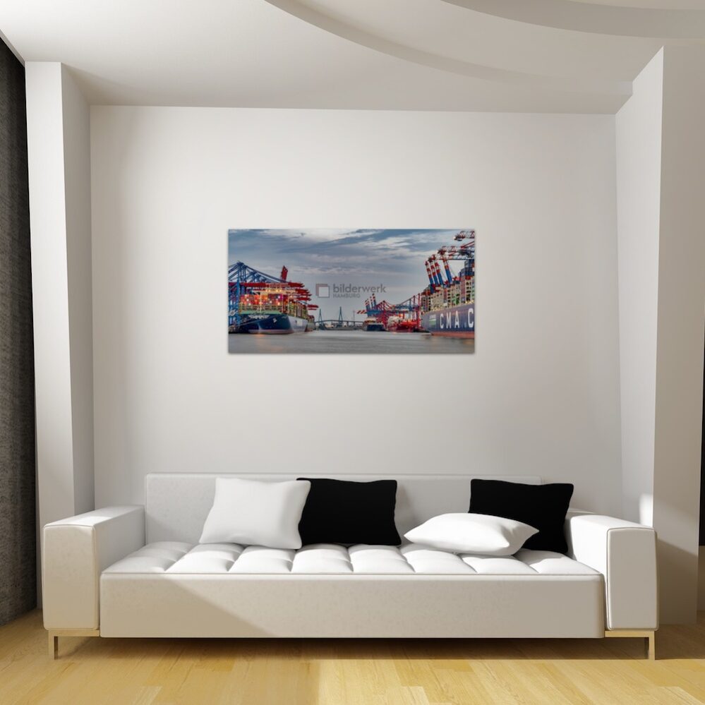 Ein ganz besonderer Blick am frühen Abend in den Waltershofer Hafen, die beeindruckenden Panorama-Bilder aus dem Hamburger Hafen als Wandbilder auf Leinwand, Alu-Verbundplatte und in Galeriequalität