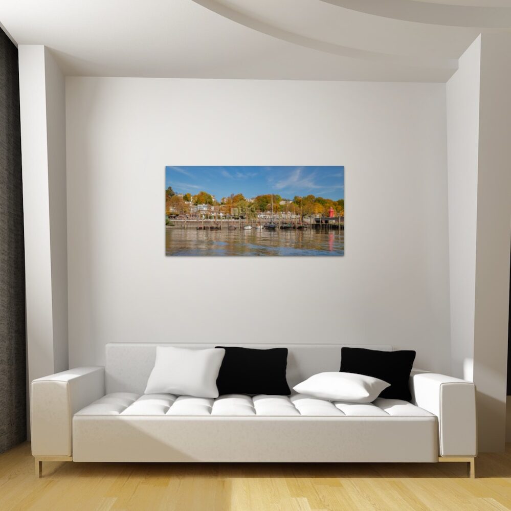 Eine wunderschöne Farbenpracht im Herbst am Museumshafen in Oevelgönne, die besonderen Blickwinkel auf Hamburg als Panoramabilder auf Leinwand, Alu-Verbundplatte und in Galeriequalität