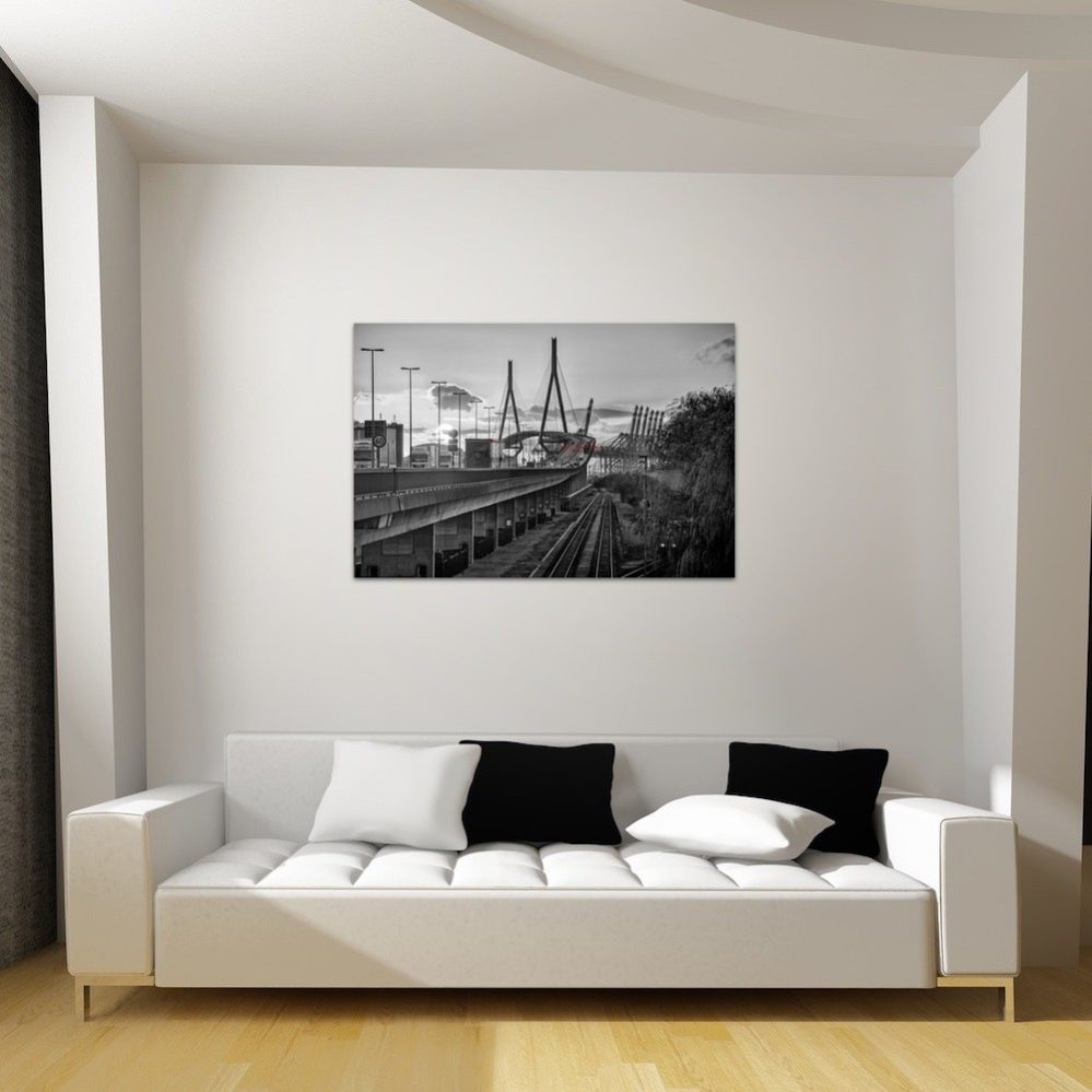 Ein ganz besonderer Blick auf die Auffahrt zur Köhlbrandbrücke in der Abendsonne, stimmungsvolle Impressionen in Schwarz-Weiss aus dem Hamburger Hafen als hochwertige Wandbilder