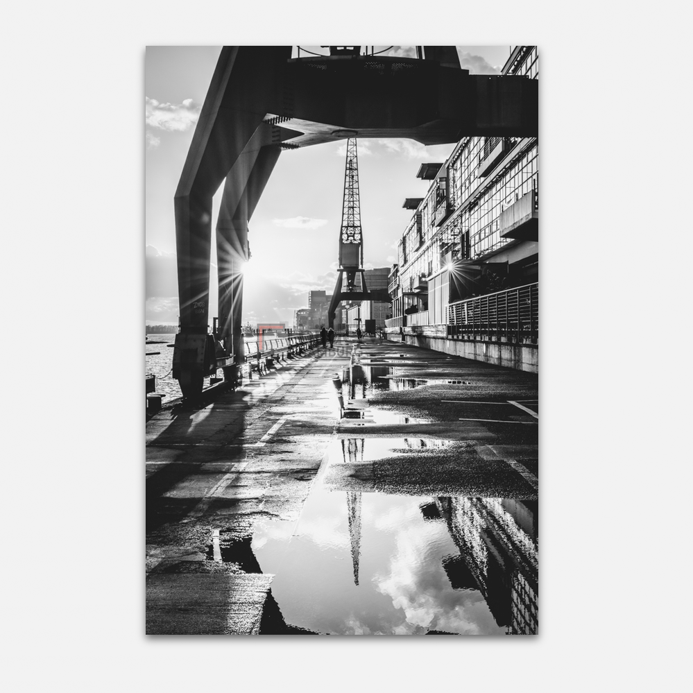 Sonnenschein nach einem Regentag an der Promenade am ehemaligen Altonaer Fischereihafen, die schönen Impressionen in Schwatz-Weiss auf dem Hamburger Hafen als Wandbilder auf Leinwand, Alu-Verbundplatte und in Galeriequalität