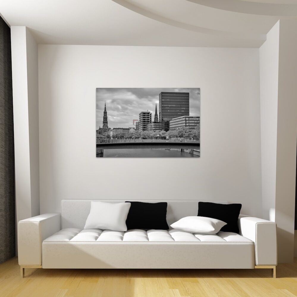 Blick auf den Wandrahmsteg über den Zollkanal in Richtung Katharinenkirche, die besonderen Motive aus Hamburg als Fotokunst in Schwarz-Weiss für Wandbilder auf Leinwand, Alu-Verbundplatte und in Galeriequalität