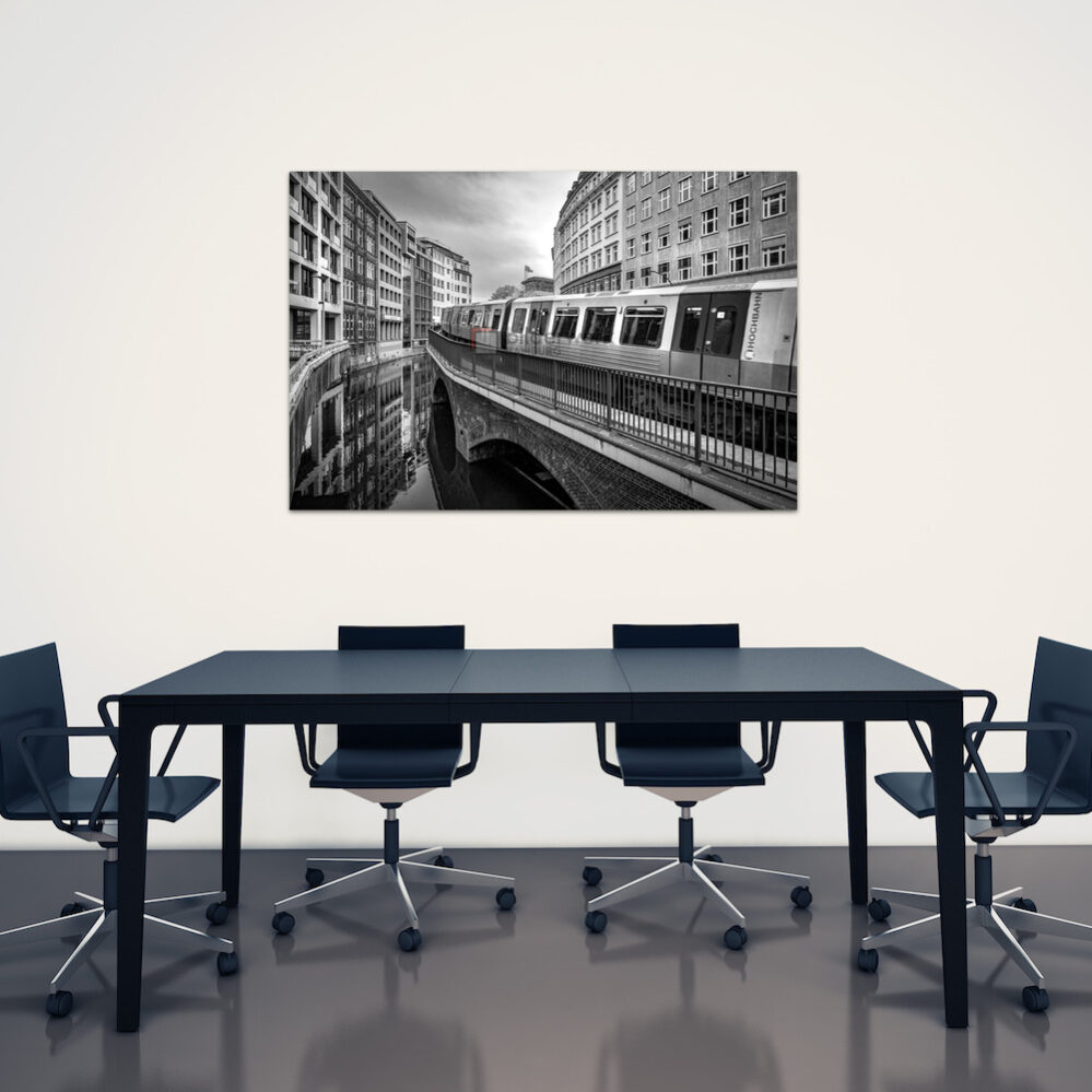 Eine U-Bahn fährt am Mönckedammfleet in Richtung Rathaus, die besonderen Motive aus der Stadt Hamburg als Fotokunst in Schwarz-Weiss für Wandbilder auf Leinwand, Alu-Verbundplatte und in Galeriequalität