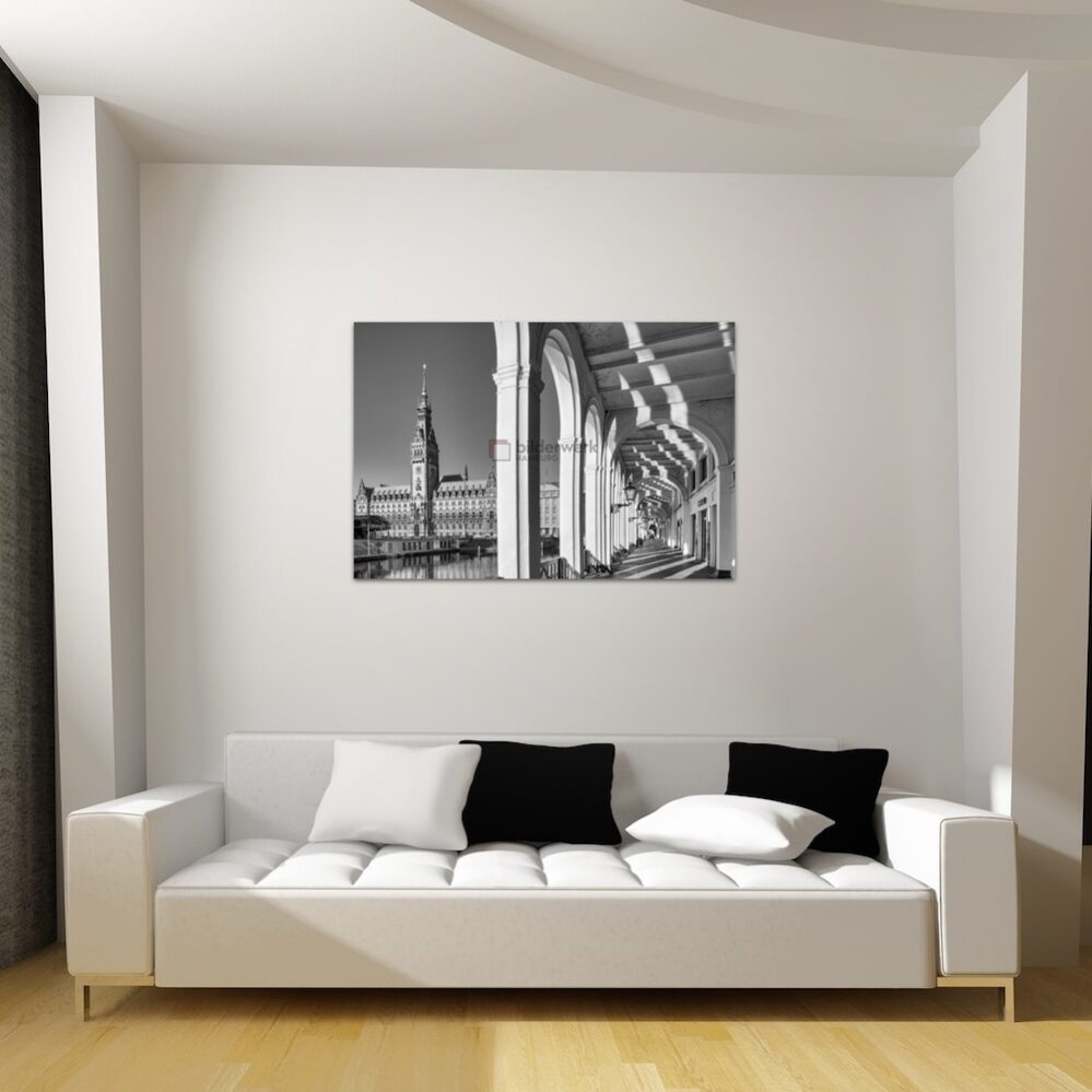 Ein wunderschöner Blick von den Alsterarkaden aus auf das Rathaus, die besonderen Motive als Fotokunst in Schwarz-Weiss aus der Stadt Hamburg als hochwertige Wandbilder auf Leinwand, Alu-Verbundplatte und in Galeriequalität