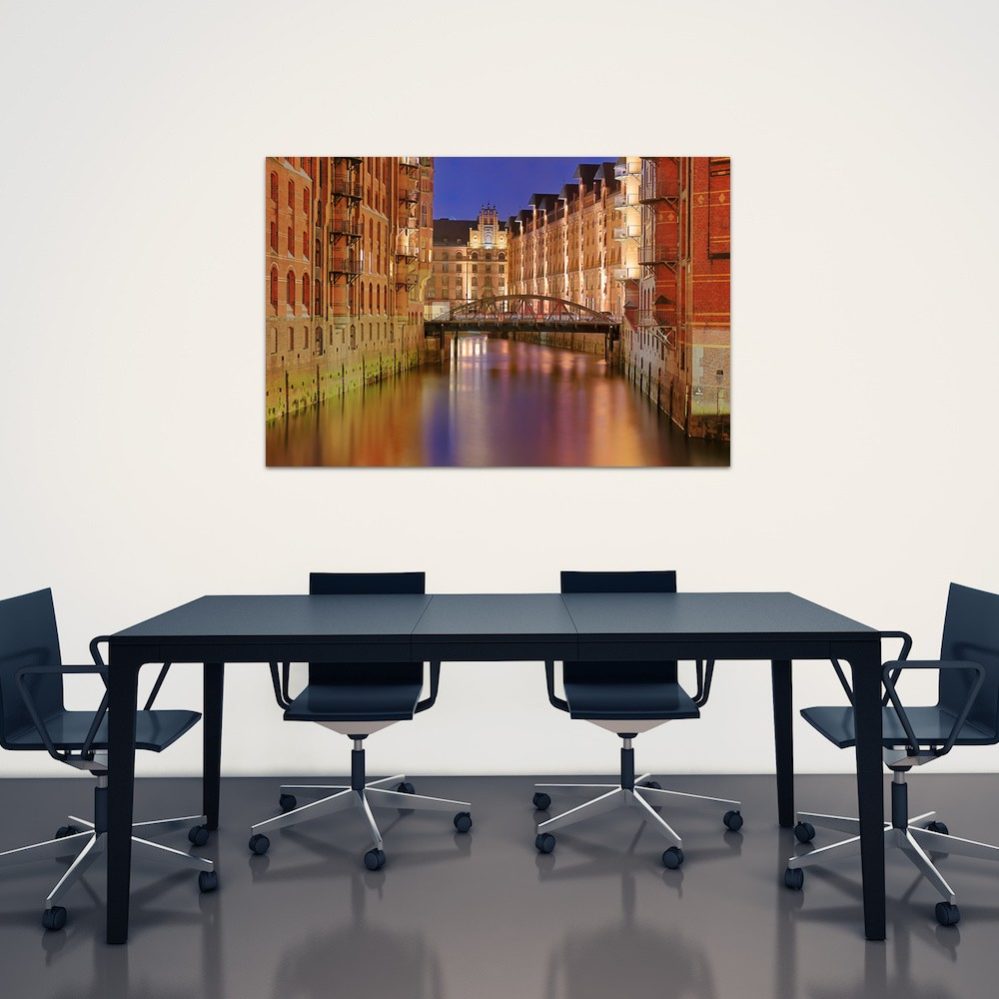 Sehr stimmungsvolle Aufnahme mit Blick aus einen der Fleete in der Speicherstadt, die besonderen Aufnahmen aus der Hamburger Speicherstadt als Motive für Wandbilder