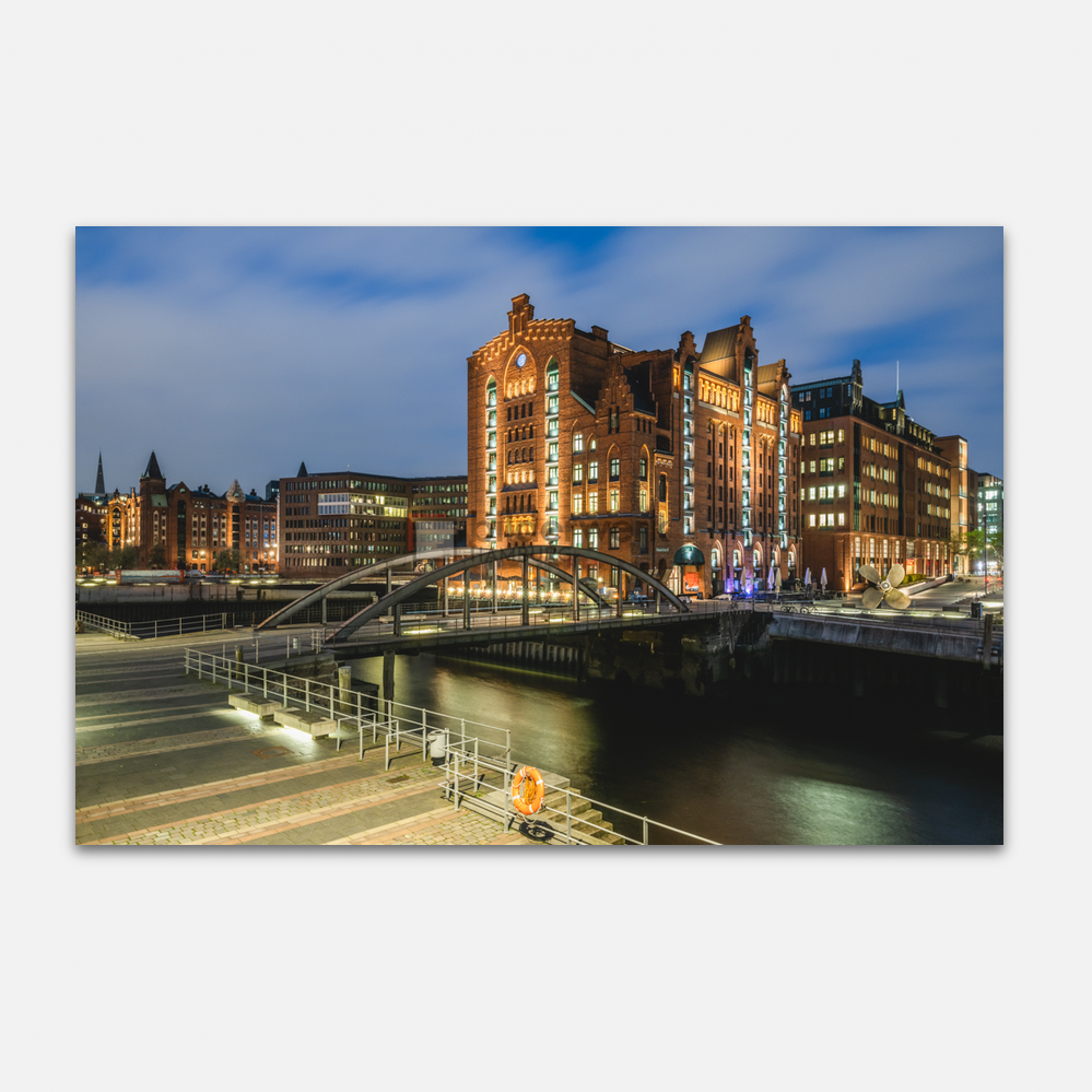 Ein imposanter Blick auf die von der Sonne angestrahlte Fassade des Maritimen Museums in der Speicherstadt, die außergewöhnlichen Impressionen aus der historischen Speicherstadt in Hamburg als Fotokunst für Wandbilder auf Leinwand, Alu-Verbundplatte und in Galeriequalität