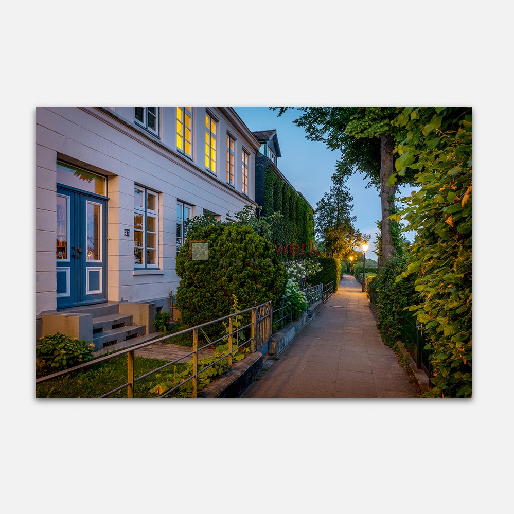 Blick auf den Fussweg in Oevelgönne mit den alten Häusern, Wandbilder mit den besonderen Blickwinkeln aus der Stadt Hamburg als Motive auf Leinwand, Alu-Verbundplatte oder in Galeriequalität