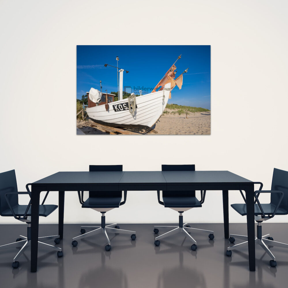 Ein Fischerboot am Strand von Koserow auf Usedom wartet auf seinen nächsten Einsatz, die schönen Bilder von den Küsten und Stränden der Ostsee als Fotokunst für Wandbilder auf Leinwand, Alu-Verbundplatte und in Galeriequalität