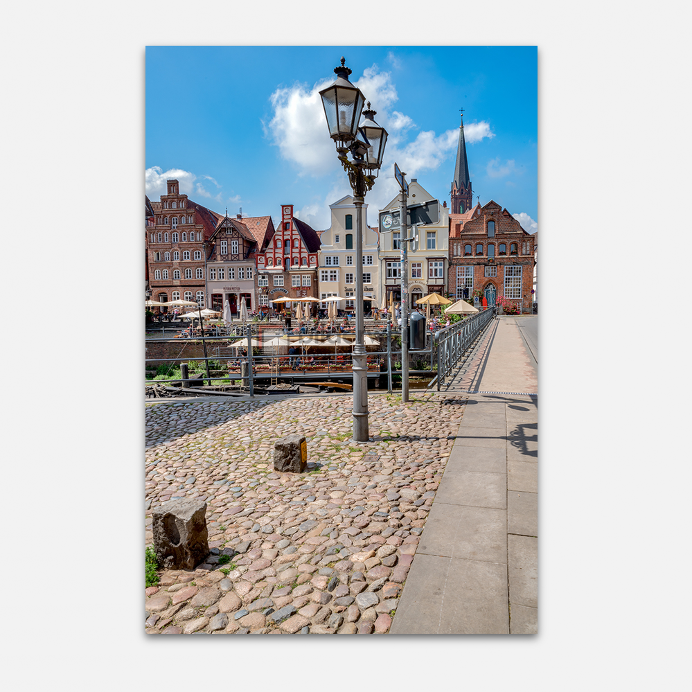 Ein schöner Blick auf das Treiben am Stintmarkt in der Altstadt von Lüneburg, die besonderen Motive von den interessanten Plätzen und Orten im Norden als Wandbilder auf Leinwand, Alu-Verbundplatte und in Galeriequalität