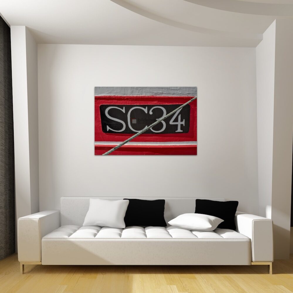 Farbenfrohe Detailaufnahme von einem Namenskürzel an einem alten Krabbenkutter im Hafen von Büsum, maritime Fotokunst mit den besonderen Motiven aus den Häfen im Norden als stilvolle Wandbilder auf Leinwand, Alu-Verbundplatte oder in Galeriequalität