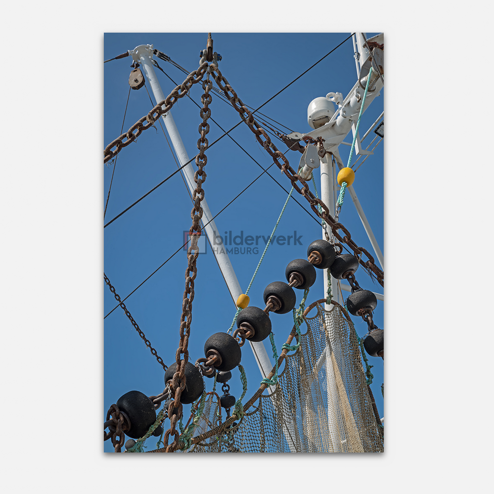 Imposanter Blick auf einen Teil des Fanggeschirrs auf einem Krabbenkutter an der Nordseeküste, maritime Fotokunst mit den besonderen Motiven von Schiffen in den Häfen des Nordens als stilvolle Wandbilder auf Leinwand, Alu-Verbundplatte oder in Galeriequalität