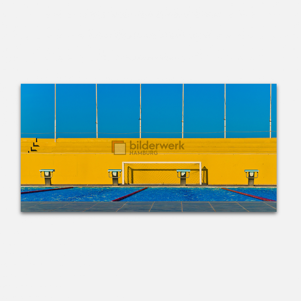Blick in ein leeres Schwimmstadion auf Rhodos, die wunderschönen und stimmungsvollen Motive aus dem Süden als Fotokunst für Wandbilder auf Leinwand, Alu-Verbundplatte oder in Galeriequalität