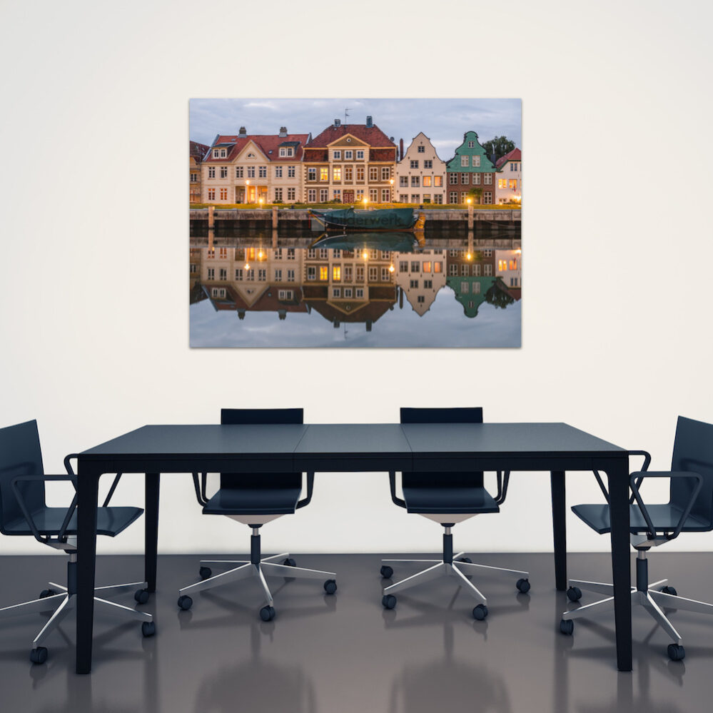 Eine wunderschöne Impression von der Häuserzeile am Hafen in Glückstadt, die beeindruckenden Aufnahmen von den Orten und Landschaften im Norden als Motive für Wandbilder auf Leinwand, Alu-Verbundplatte und in Galeriequalität