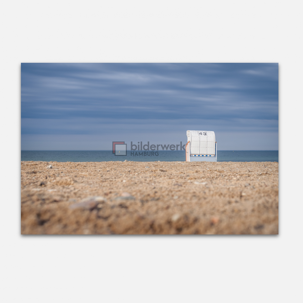 Ein einsamer Strandkorb an dem wolkenverhangenen Strand von Behrensdorf an der Ostseeküste, die stimmungesvollen Impressionen von den Küsten der Ostsee als Fotokunst für Wandbilder auf Leinwand, Alu-Verbundplatte und in Galeriequalität
