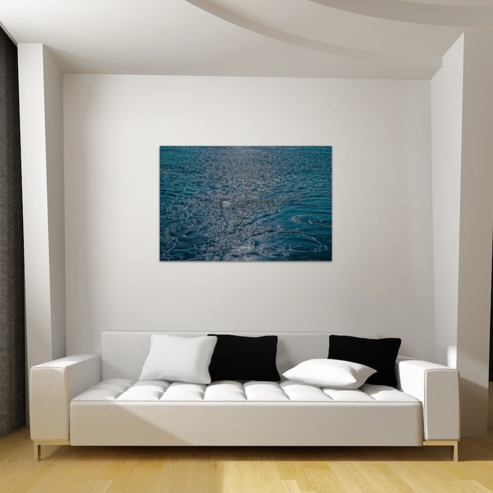 Ein besonders gestalteter Blick auf das von der Sonne erleuchtete Fahrwasser einer Fähre auf der Nordsee, beeindruckende Fotokunst mit den schönen Bildern vom Meer als anspruchsvolle Wandbilder auf Leinwand, Alu-Verbundplatte und in Galeriequalität