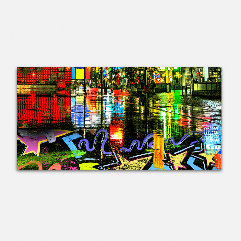 Spiegelungen der Leuchtreklamen in einer Pfütze auf dem Spielbudenplatz an der Reeperbahn, Wandbilder mit stimmungsvollen Collagen von Motiven aus Hamburg auf Leinwand, Alu-Verbundplatte oder in Galeriequalität