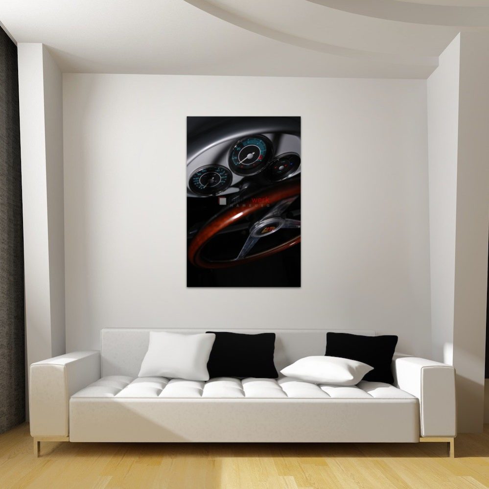 Holz-Lenkrad in einem historischen Porsche, Wandbilder mit Motiven von Gegenständen aus dem Alltag als aussergewöhnliche Fotokunst auf Leinwand, Alu-Verbundplatte oder in Galeriequalität