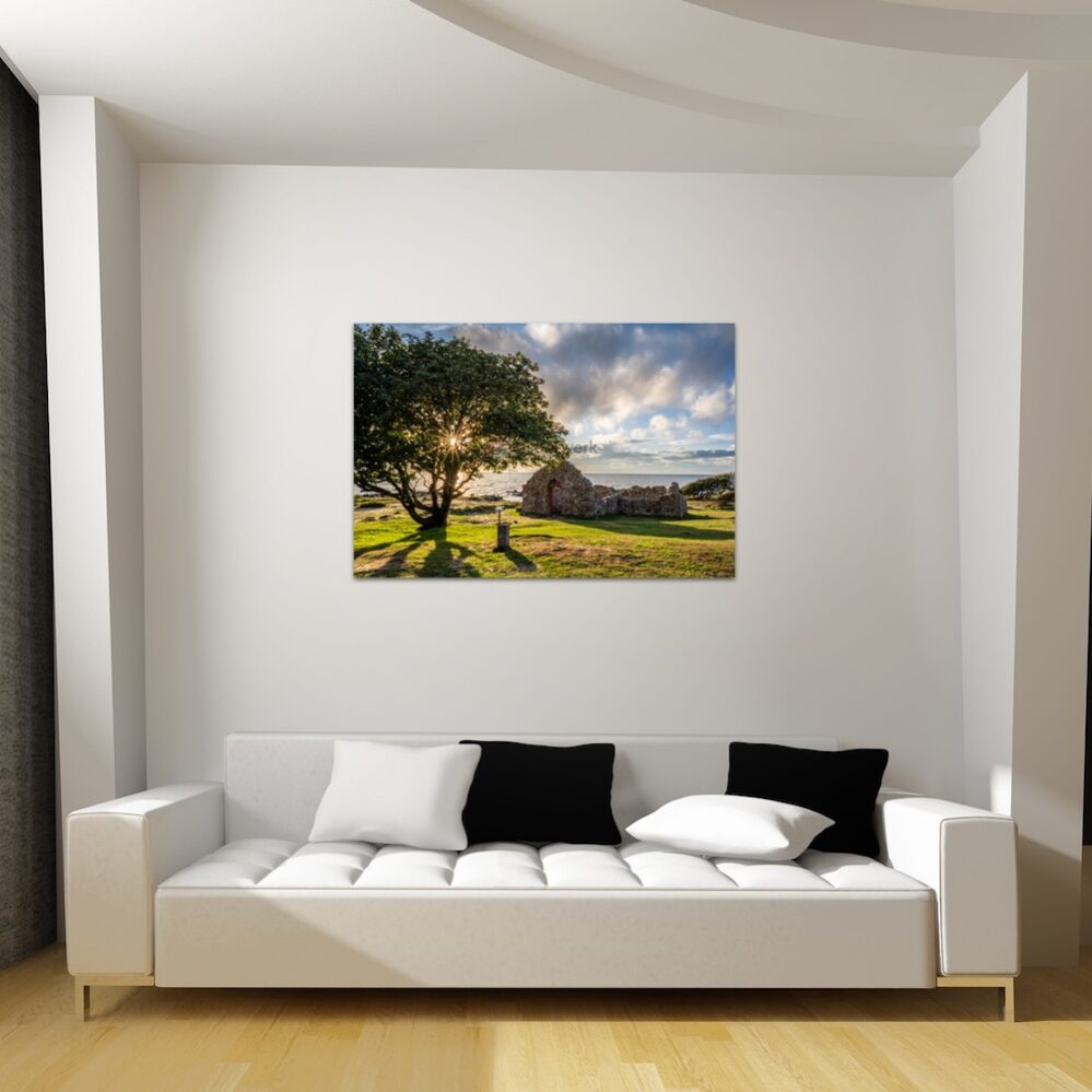 Eine stimmungsvolle Aufnahme von der alten Kirchenruine im Norden der Ostseeinsel Bornholm, die beeindruckenden Landschaften und Orte in Skandinavien als Fotokunst für Wandbilder auf Leinwand, Alu-Verbundplatte und in Galeriequalität