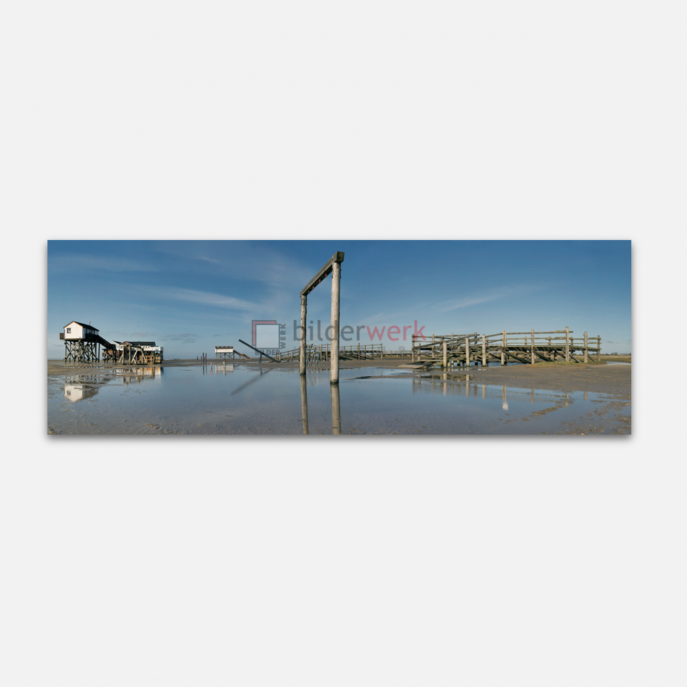 Blick auf die Pfahlbauten am Strand von Sankt Peter Ording an der Nordsee, Wandbilder mit den aussergewöhnlichen Motiven aus Sankt Peter Ording als Fotokunst