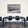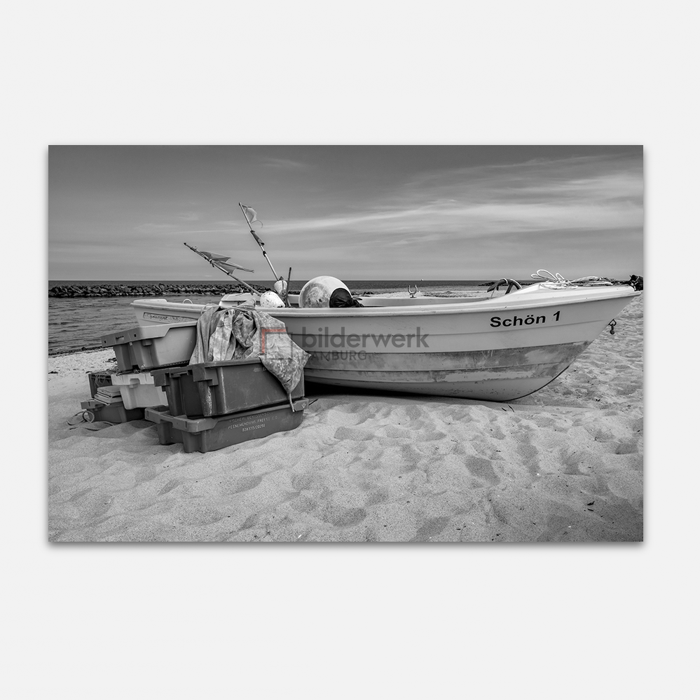Ein Boot der Fischer am Schönberger Strand an der Ostsee wartet auf seinen nächsten Einsatz, die besonderen Impressionen von den Küsten und Stränden der Ostsee als Fotokunst in Schwarz-Weiss für Wandbilder auf Leinwand, Alu-Verbundplatte und in Galeriequalität