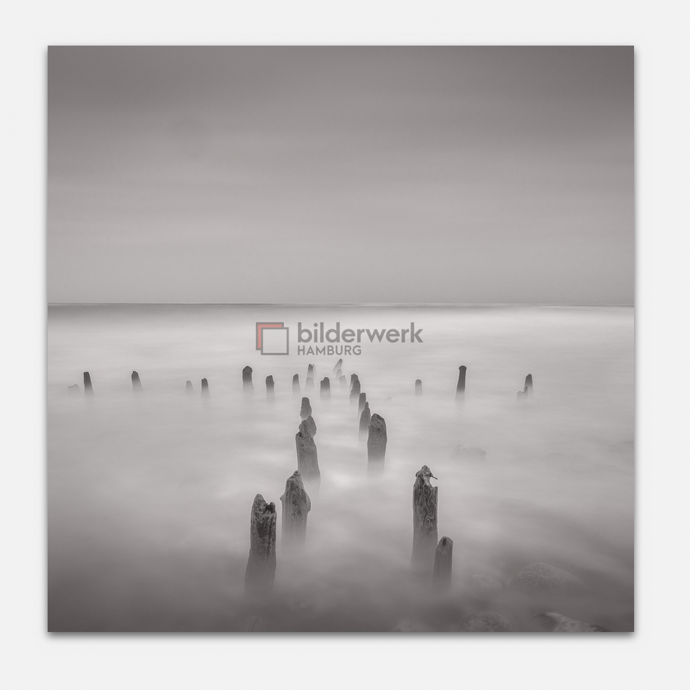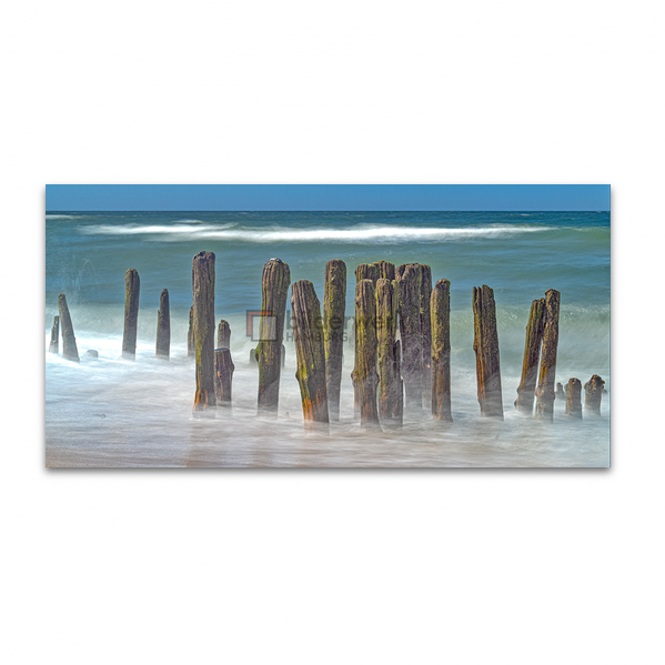 Ein beeindruckend inszenierter Blick auf die alten Buhnen am Sehlendorfer Strand an der Ostsee, die besonderen Motive von den Stränden der Nord- und Ostsee als Fotokunst für Wandbilder auf Leinwand, Alu-Verbundplatte und in Galeriequalität