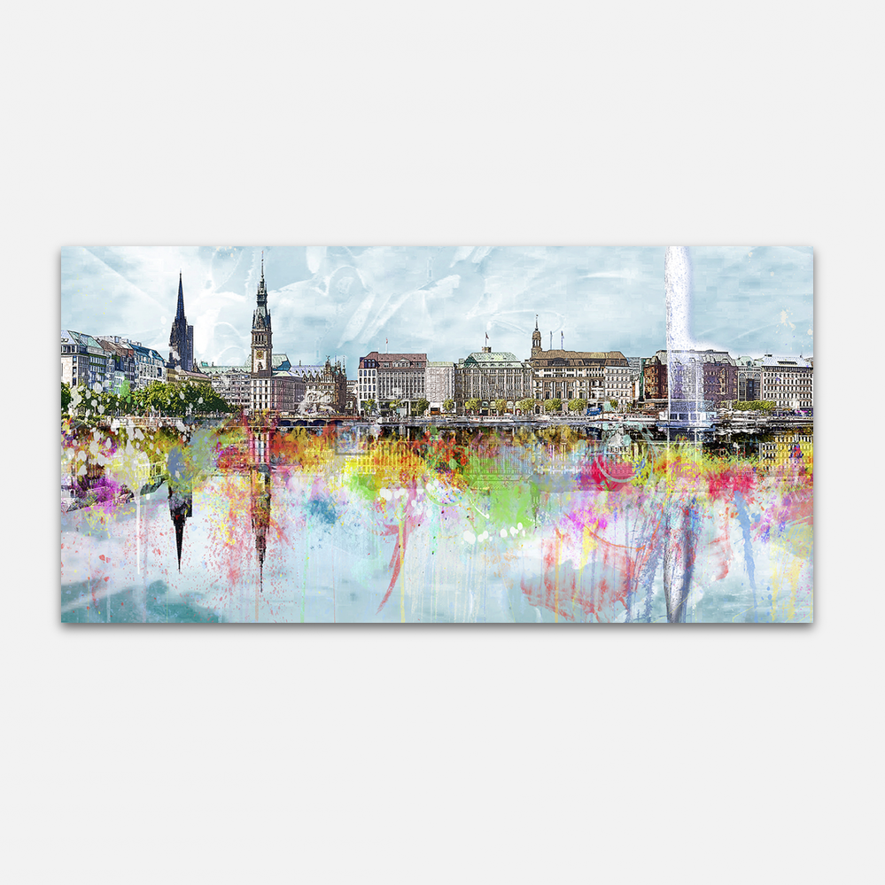 Panoramablick auf die Kulisse an der Binnenalster im Pop-Art-Stil, Kunstdrucke mit den modern gestalteten Motiven aus der Stadt Hamburg als Wandbilder auf Leinwand, Alu-Verbundplatte und in Galeriequalität