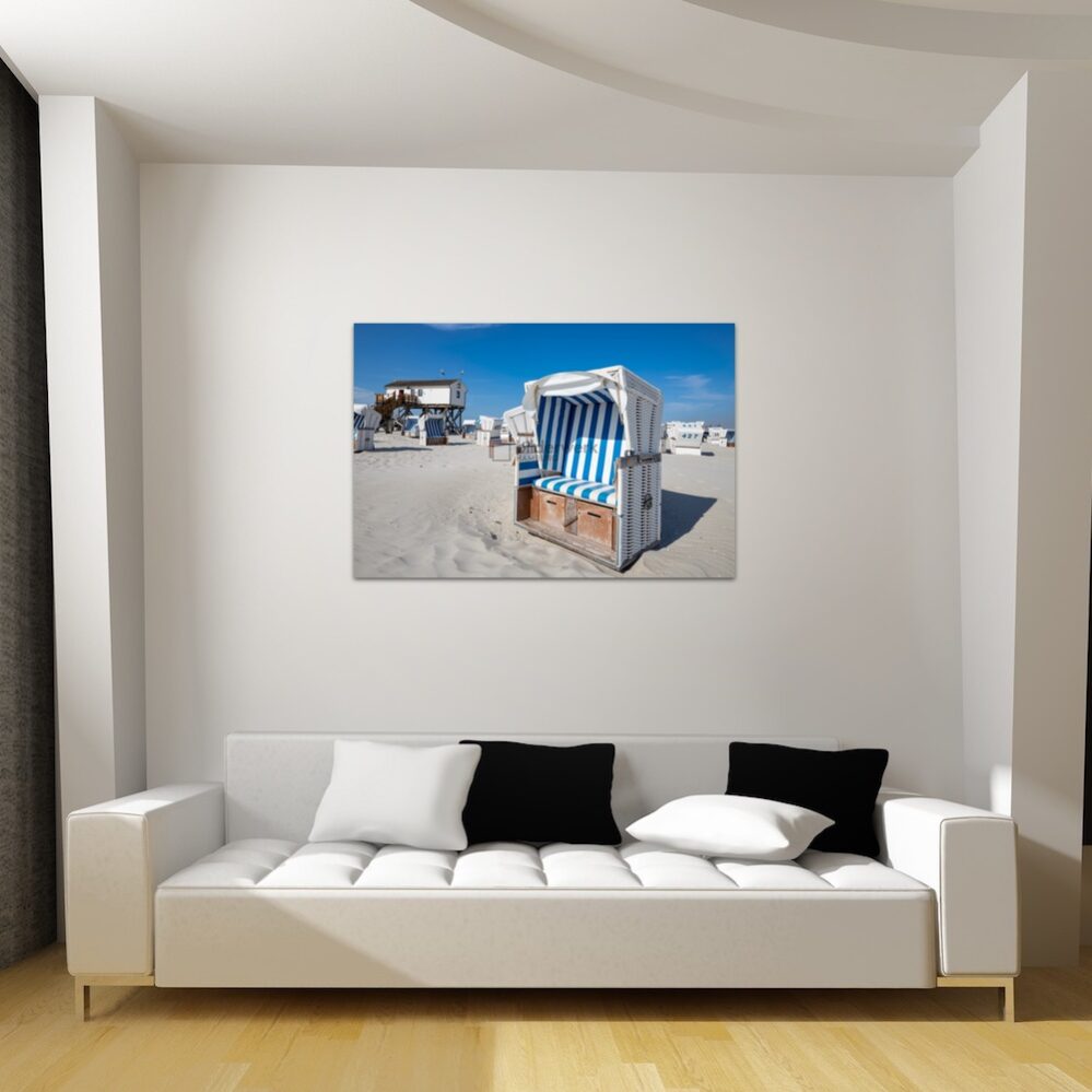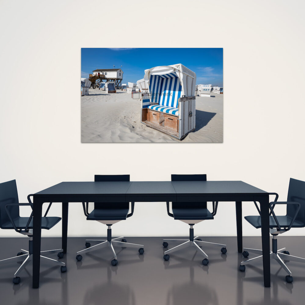 Blick auf die noch leeren Strandkörbe bei sonnigem Wetter in Sankt Peter Ording, die schönen Impressionen von den Stränden und Küsten an der Nordsee als Fotokunst für Wandbilder auf Leinwand, Alu-Verbundplatte und in Galeriequalität