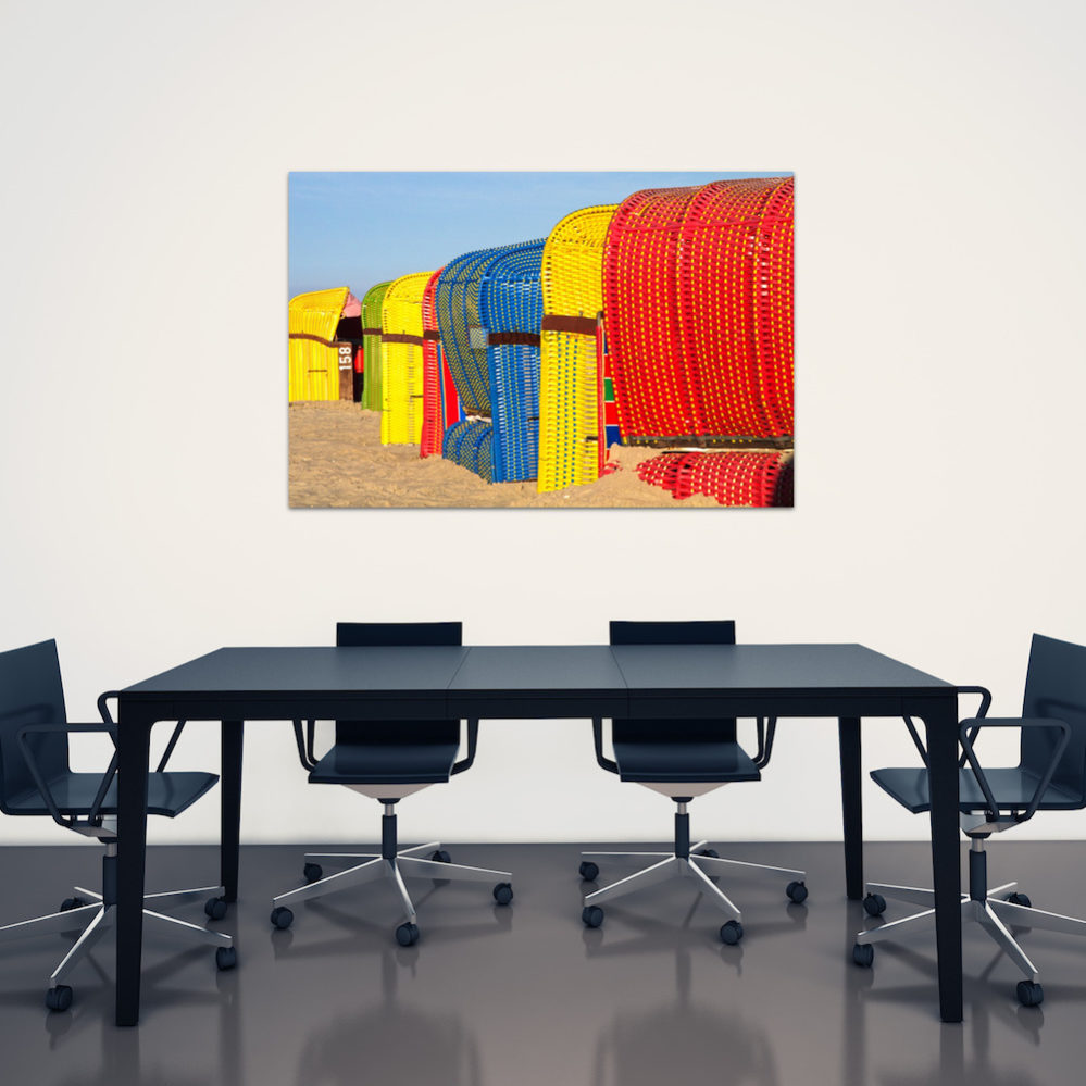 Farbenfroher Blick auf die Strandkörbe in Nieblum auf Föhr, die besonderen Strandimpressionen von der Nordsee als Vorlage für stimmungsvolle Wandbilder
