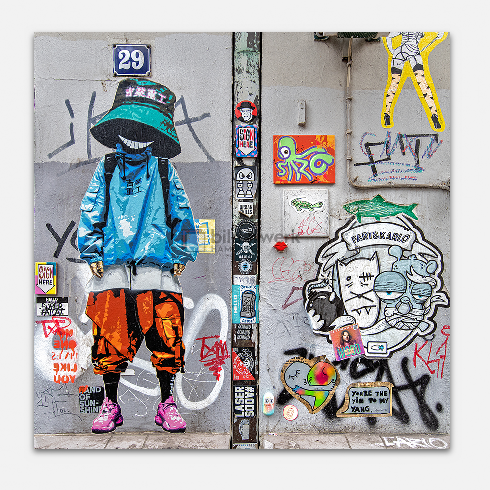 Verschieden Motive in verschiedenen Techniken an einer Hauswand auf Sankt Pauli. Street-Art, Graffiti und andere Strassenkunst aus Hamburg als Fotokunst für Wandbilder auf Leinwand, Alu-Verbundplatte oder in Galeriequalität