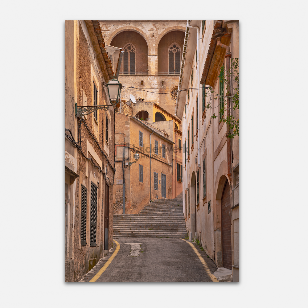 Beeindruckender Blick auf eine der Gasse, die hoch zur Kirche in Arta auf Mallorca führen, Fotokunst mit beeindruckenden und ausgefallenen Motiven aus den Ländern rund um das Mittelmeer als Wandbilder für mehr Abwechslung an den Wänden