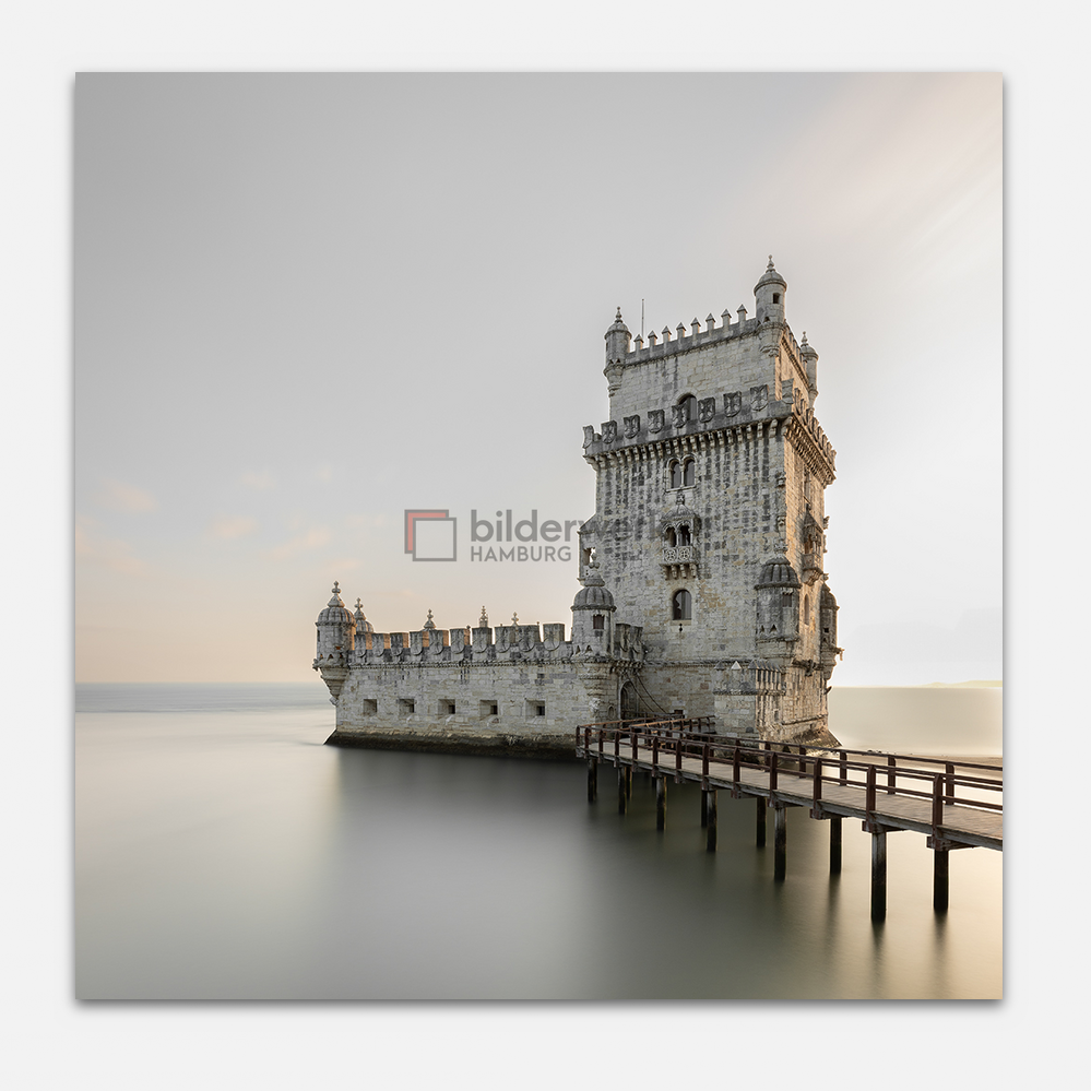 Ein faszinierender Blick zu Sonnenuntergang auf den alten Befestigungsturm am Hafen von Lissabon, die besonderen Motiven von den schönen Orten und Plätzen der Welt als Fotokunst für Wandbilder auf Leinwand, Alu-Verbundplatte und in Galeriequalität