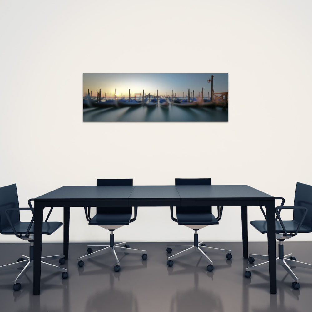 Eine außergewöhnliche Morgenstimmung mit den Gondeln am San Marco in Venedig, die besonderen Impressionen von den schönen Orten und Landschaften der Welt als Fotokunst für Wandbilder auf Leinwand, Alu-Verbundplatte und in Galeriequalität