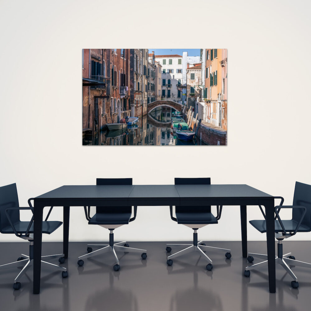 Eine schöne stimmungsvolle Szenerie an einem der kleineren Kanäle in der Lagunenstadt Venedig, die besonderen Impressionen von den schönen Orten und Landschaften der Welt als Fotokunst für Wandbilder auf Leinwand, Alu-Verbundplatte und in Galeriequalität