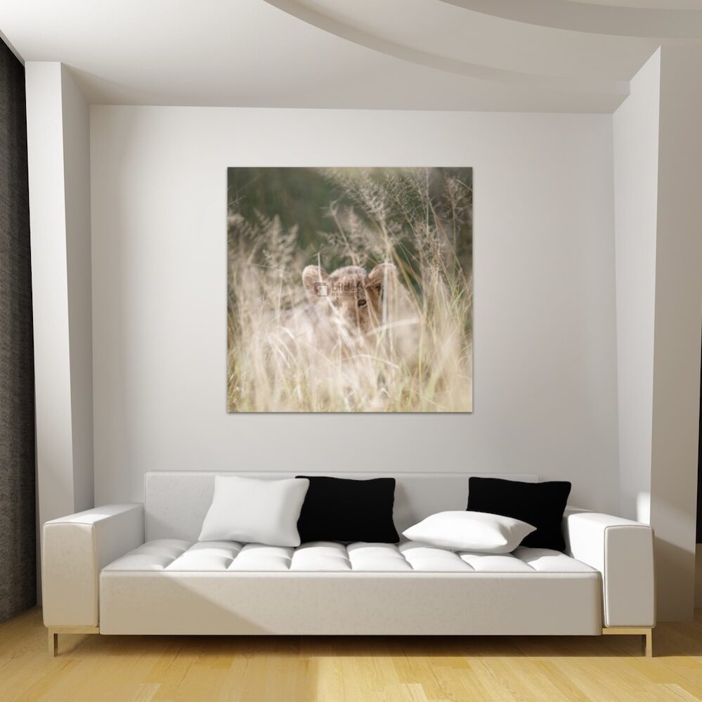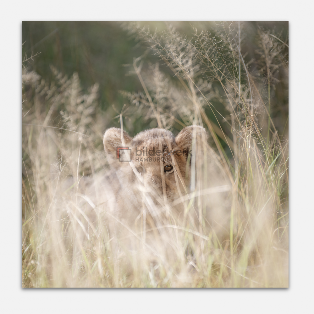 Eine wunderschöne Aufnahme von einem Löwenbaby im Gras der Savanne Südafrikas, Fotokunst mit den besonderen Motiven aus der Wildnis in Afrika als Wandbilder auf Leinwand, Alu-Verbundplatte und in Galeriequalität