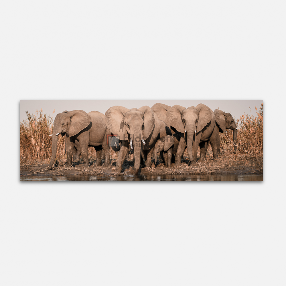 Eine Elefantenherde nähert sich dem Ufer vom Sambesi River in Sambia, die außergewöhnlichen Motive von den Tieren und Landschaften in der Natur von Afrika als Fotokunst für Wandbilder auf Leinwand, Alu-Verbundplatte und in Galeriequalität
