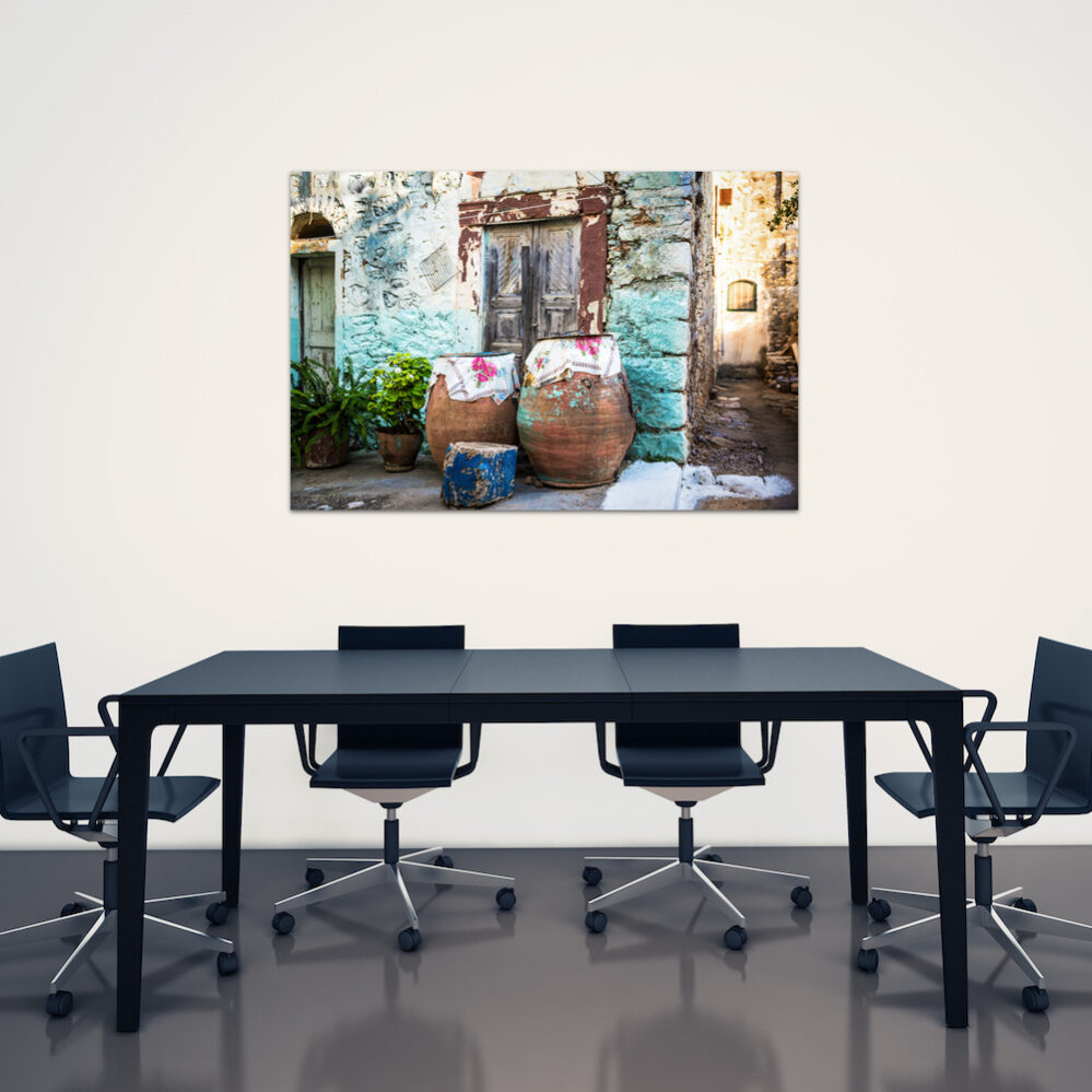 Fassade eines verfallenen Hauses in Chios, die wunderschönen und stimmungsvollen Motive aus dem Süden als Fotokunst für Wandbilder auf Leinwand, Alu-Verbundplatte und in Galeriequalität